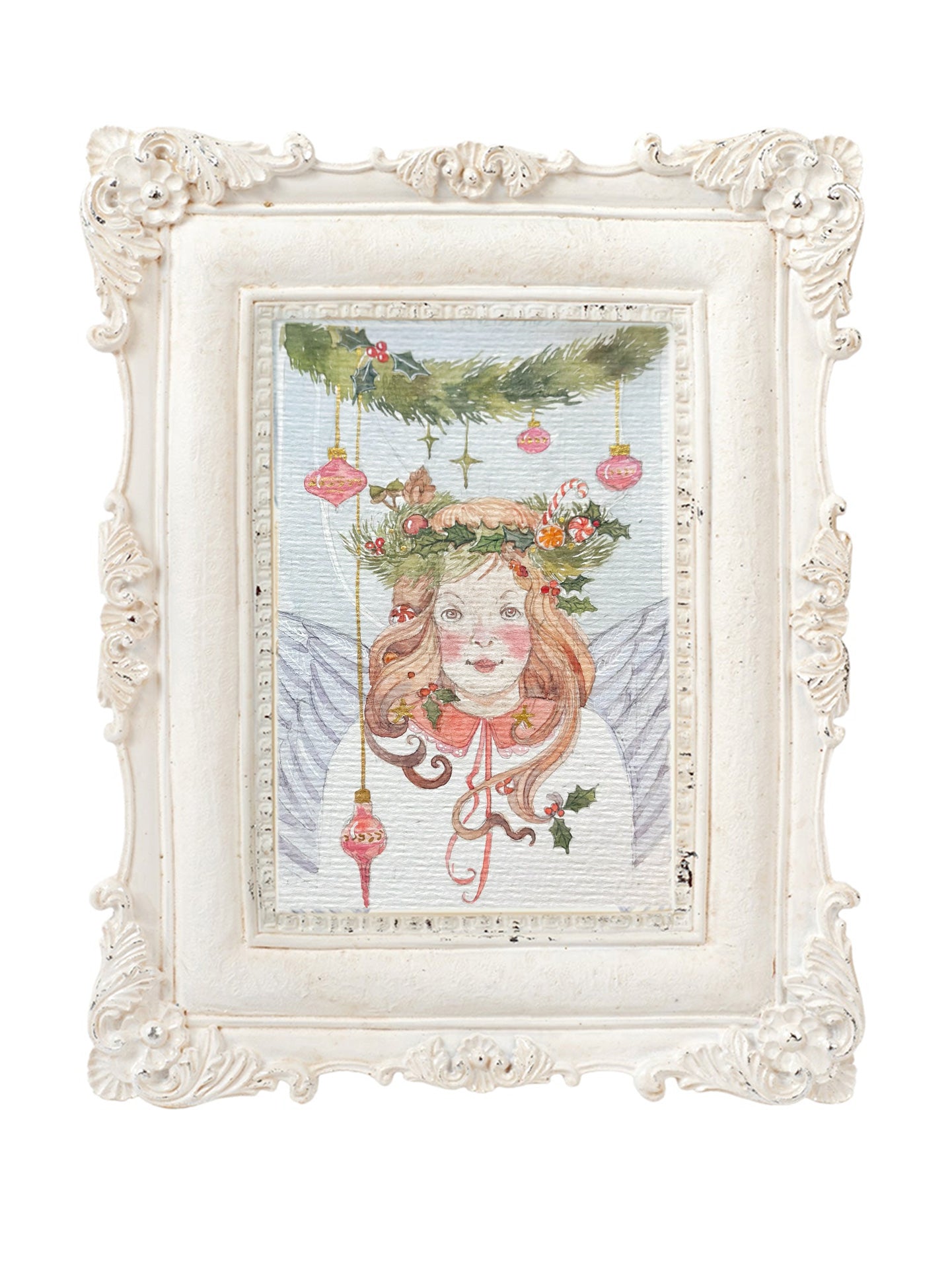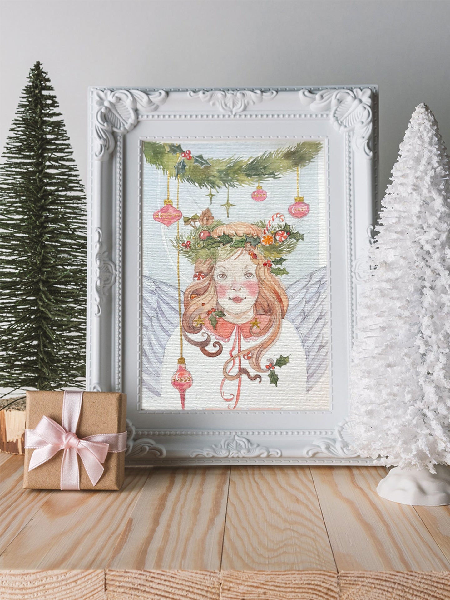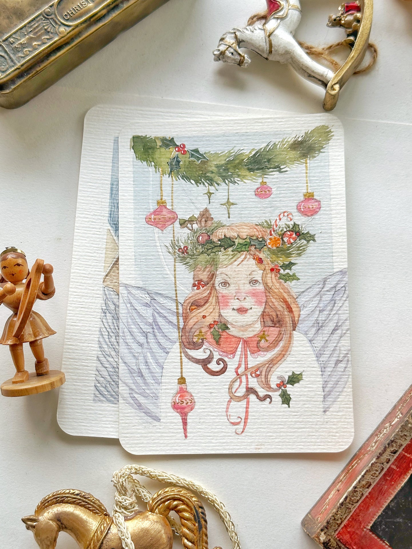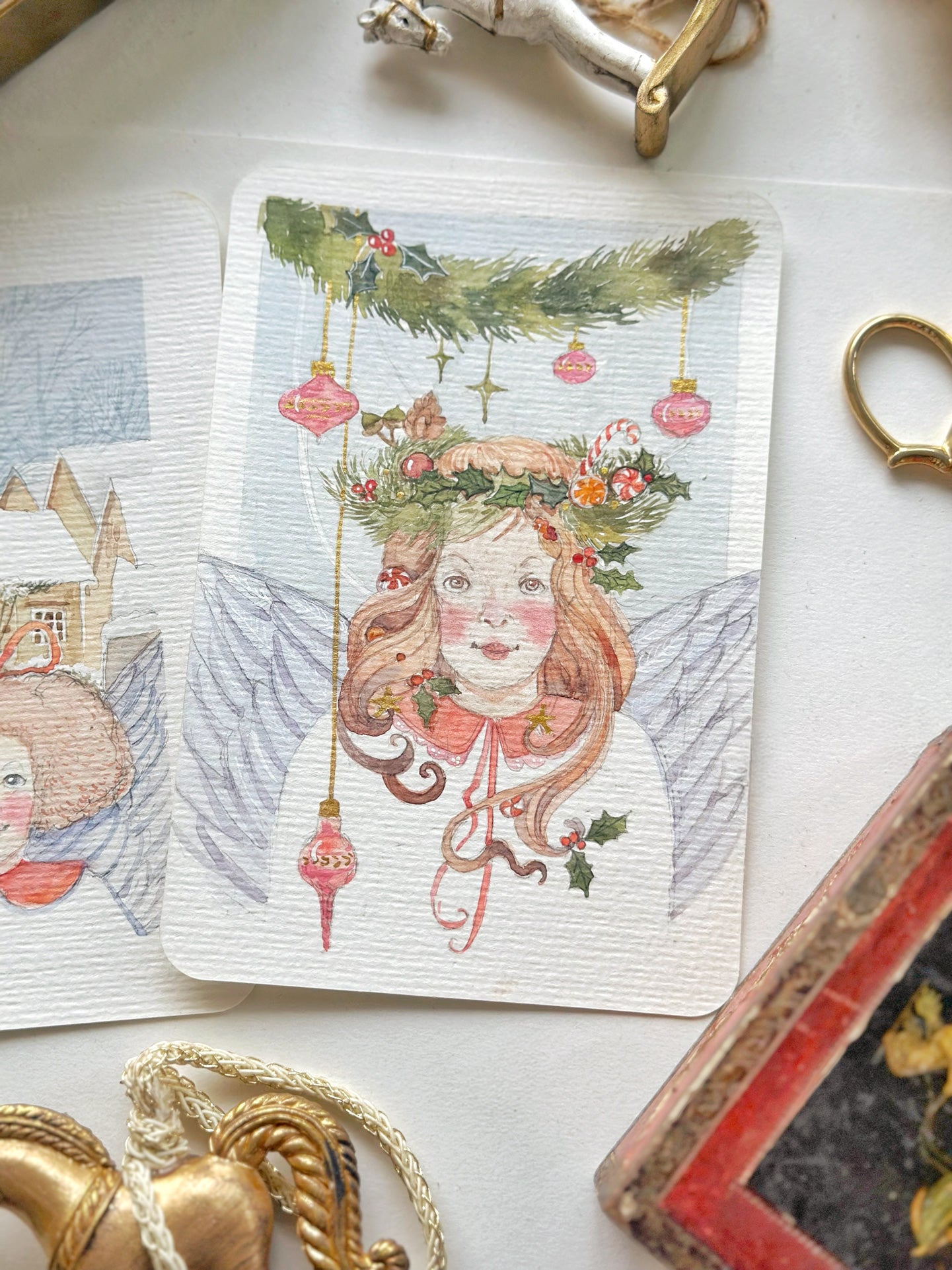 This hand-painted postcard captures a feeling many of us know well from childhood—those winter moments when the world felt bigger, softer, and full of stories waiting to be imagined. She stands on her own little landscape, wrapped up against the cold, as if she  just paused in the middle of an adventure.